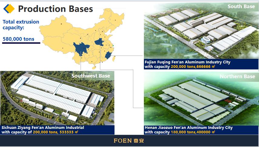 FENAN ALUMINUM CO., LTD., gegründet 1988, ist ein umfassendes intelligentes Fertigungsunternehmen, das sich auf Forschung und Entwicklung, Produktion und Direktvertrieb verschiedener Aluminiumprodukte spezialisiert hat, darunter architektonische Aluminiumprofile, industrielle Aluminiumprofile , Leichtbaualuminium für die Automobilindustrie , Und Systemtüren und Fenster Mit einer Gesamtfläche von über 2.000 Acres und acht Produktionsstandorten verfügt es über starke Forschungskapazitäten durch sein Forschungsinstitut für Aluminiumtechnologie und seine Business School.