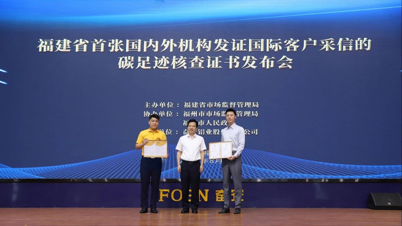 Am 19. August wurde der FOEN Aluminum Co., Ltd. das erste CO2-Zertifikat der Provinz Fujian offiziell überreicht. Das Zertifikat wurde von in- und ausländischen Zertifizierungsstellen ausgestellt und von internationalen Kunden anerkannt. Zu den bei der Zeremonie anwesenden Führungskräften gehörten Huang Shuimu, Sekretär der Parteiführungsgruppe und Direktor der Marktregulierungsbehörde der Provinz Fujian; Chen Zongsheng, Sekretär der Parteiführungsgruppe und Direktor der Marktregulierungsbehörde von Fuzhou; und Lin Hezhi, Vizebürgermeister der Stadt Fuqing. Ebenfalls anwesend waren Huang Fen, Vorstandsvorsitzender der FOEN Aluminum Co., Ltd., sowie zuständige Mitarbeiter der Marktregulierungsbehörden der Provinz und des Metrologieinstituts der Provinz Fujian, Vertreter der China Quality Mark Certification Group und von Intertek Testing Services (Shanghai) Co., Ltd.