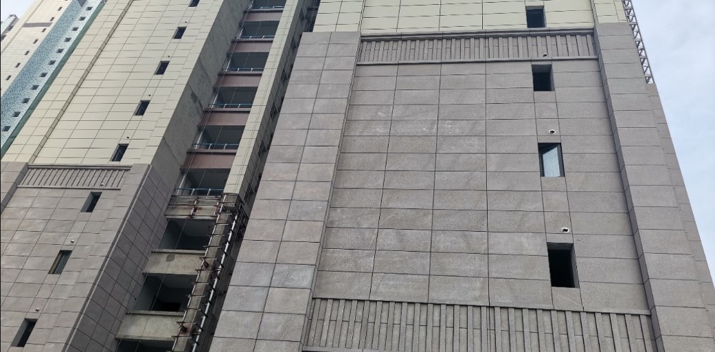 (1) Vorhangfassade aus Porzellanplatten: Die Vorhangfassade eines Gebäudes besteht aus Porzellanplatten als Paneel. Die durchschnittliche Wasseraufnahmerate der Platte beträgt E≤0,5 % und die trockengepresste Keramikplatte.