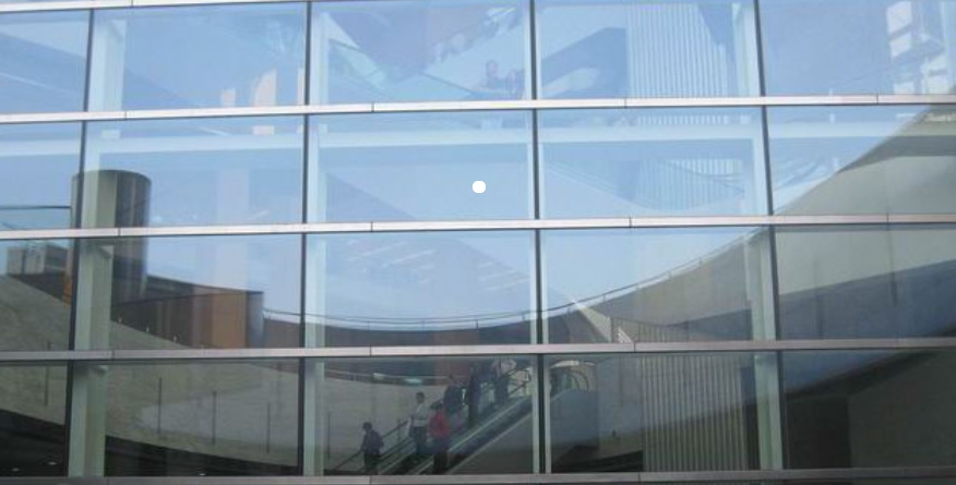 1. Glasfassade : Das Plattenmaterial ist eine Gebäudevorhangfassade aus Glas.