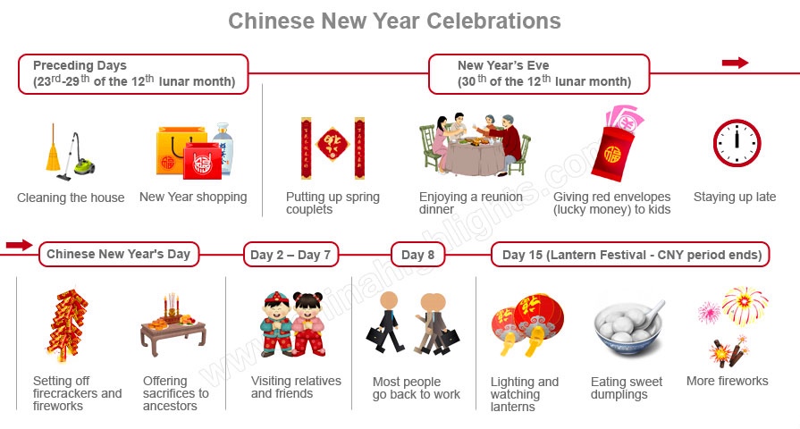 Zu den wichtigsten Aktivitäten zum chinesischen Neujahr gehören 1) das Aufhängen von Dekorationen, 2) das gemeinsame Abendessen mit der Familie am Silvesterabend, 3) das Abfeuern von Knallkörpern und Feuerwerk sowie 4) das Überreichen von roten Umschlägen und anderen Geschenken. Diese vier Dinge werden im Folgenden vorgestellt.